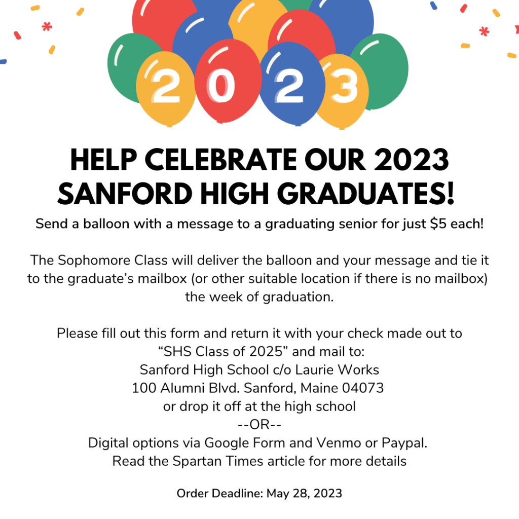 The sophomore class (2025) has taken on the annual Balloons for Graduates Fundraiser, where students, staff and members of the community can buy a balloon for a member of the Class of 2023. They can also include a personalized message for that graduate. Orders must be in by May 28, 2023.
