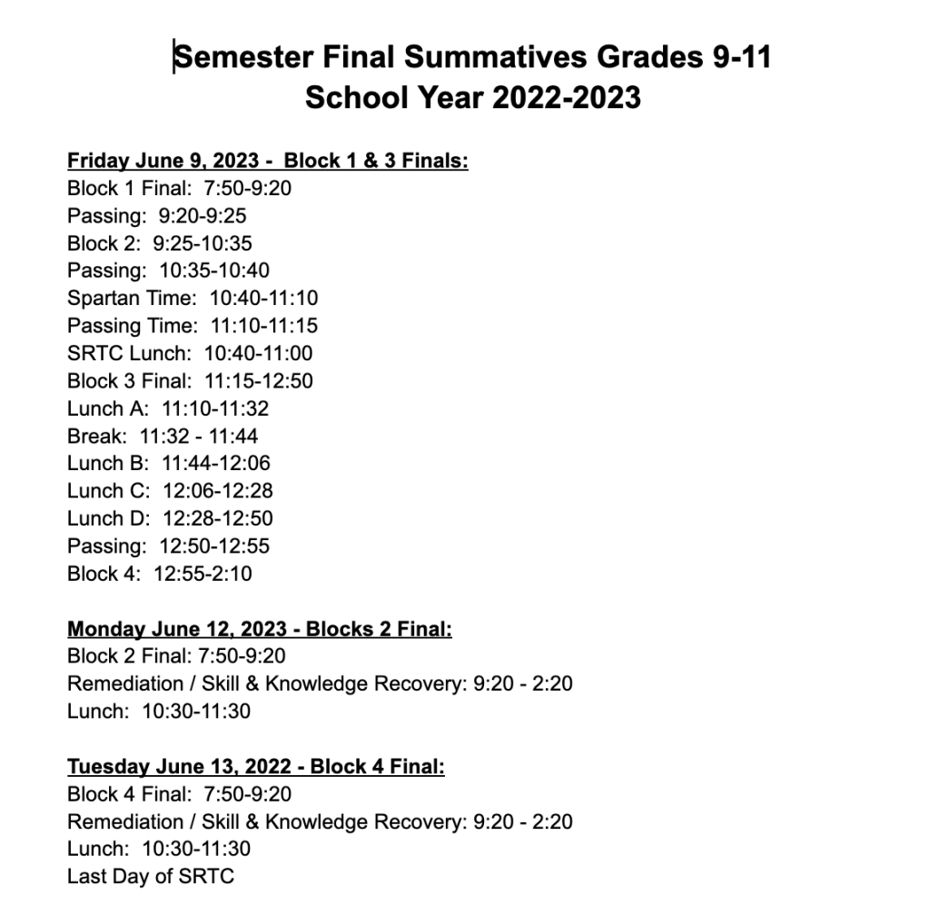 The first day of finals for underclassmen begins on Friday, June 9 for Blocks 1 and 3. Friday is a modified schedule, which will include one and a half hours for each final, and the rest of the classes that day will be shorter.