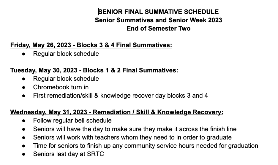 Senior exams occur on regular block schedule days. On Friday, May 26, they will take their Blocks 3 and 4 exams. On Tuesday, May 30, they take their Blocks 1 and 2 exams and have time for remediation and skill recovery for any classes they need. They may turn in their Chromebooks if no remediation is necessary. Wednesday, May 31 is the final senior remediation day.
