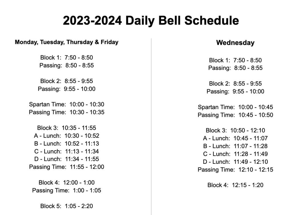 Also new this year is the schedule at the high school and SHS, which has moved to a five-block schedule, as shown below.