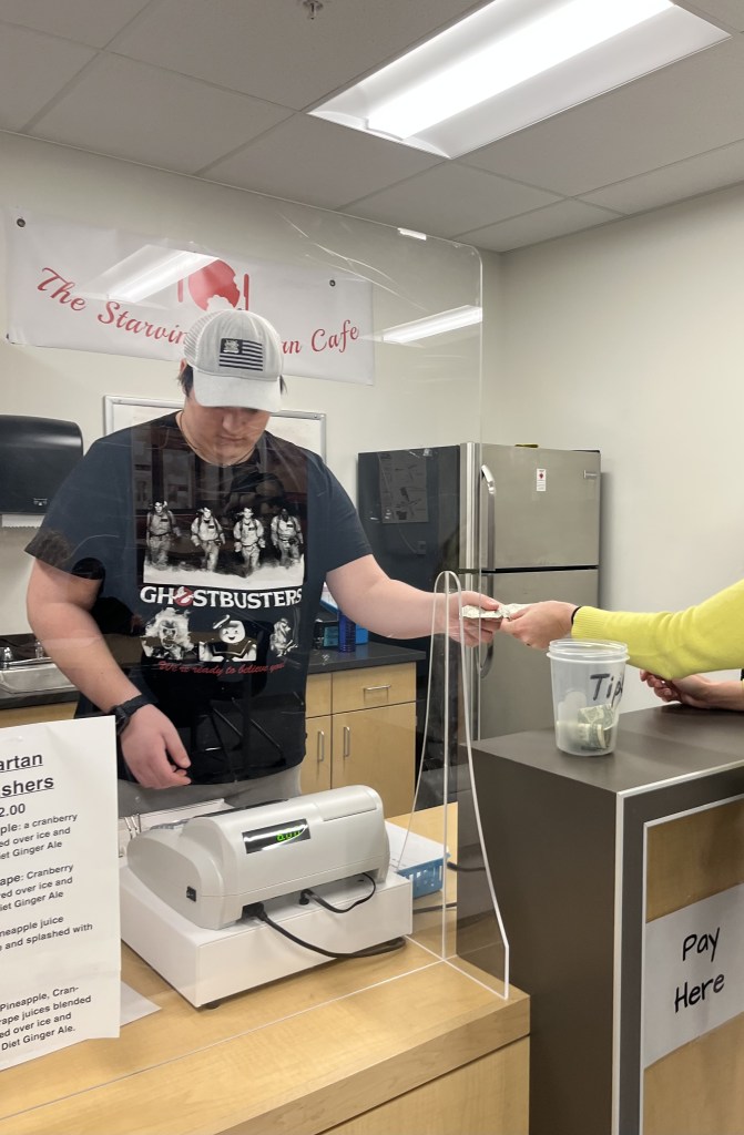 The Starving Spartan Cafe is based in one of the Special Education Centers in the school, and the staff is made up of the students in their classes. The Cafe allows the students to learn life and job skills that they will be able to use later in life, such as counting money, giving change to customers, using a register, and cooking.