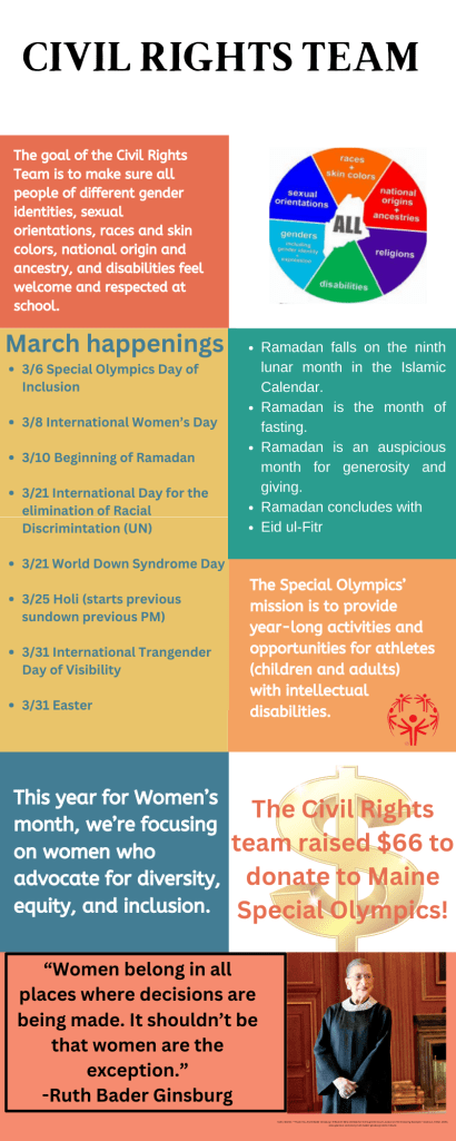If you would like to join Civil Rights Team, we meet in the library on Mondays at 2:25.