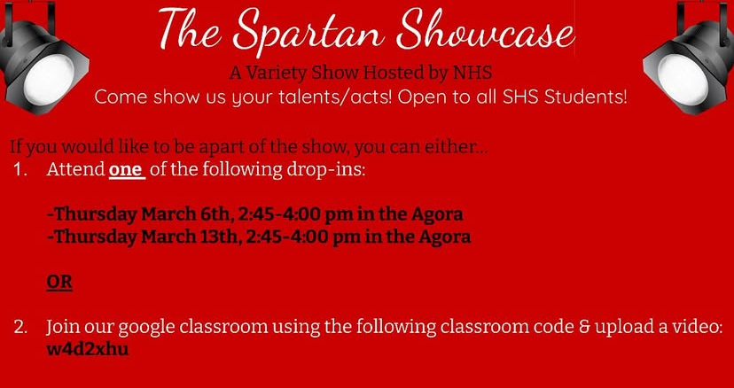 SANFORD, Maine – The Sanford High School National Honor Society is hosting drop-in auditions for the Spartan Showcase after school in the agora until 4 p.m., on Thursday, March 6., and Thursday, March 13. The Spartan Showcase will take place in April.